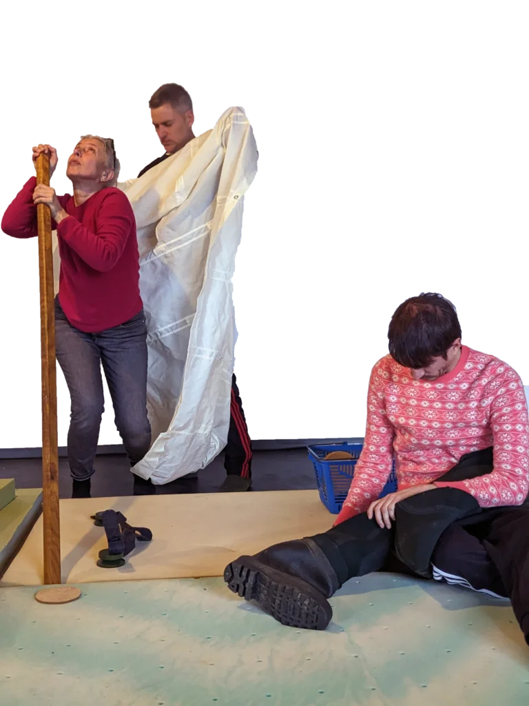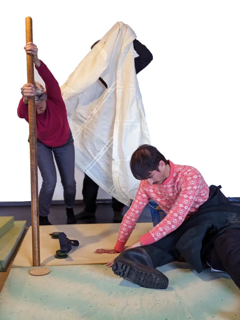 Meeting through… is performative installation environment that invites the audience to witness performance as a process-based work. The audience is implicated and part of the questions that the work raises and by giving instruction and actions of participation to those who are willing to contribute. By creating a space of exchange inside the performance space this project wants to facilitate access to questioning our response-ability to the world we are living in and sharing the troubles and anxieties that come with it. It wants to create a space of sociability that can host a sense of being with and induce will for staying with the trouble as a modality of repair. In this sense, this research-creation wants to commit in creating an engaged performative environment. And by doing this create a community of people concerned and willing to collaborate and develop further strategies of integration.