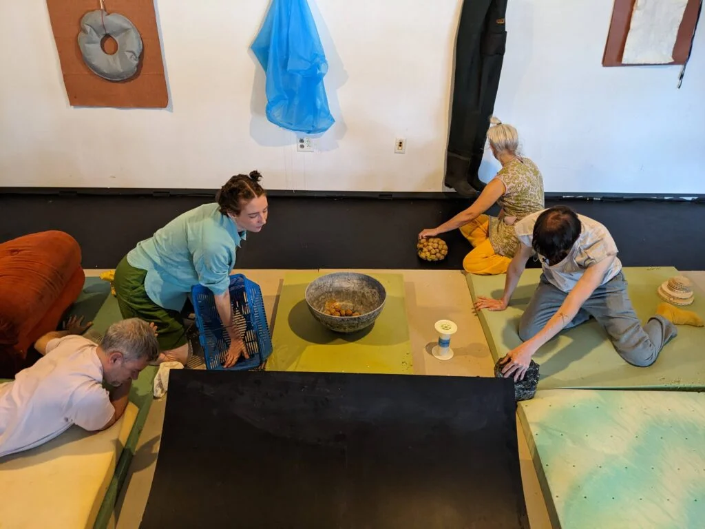 3. Somatic dances – based on somatic work with the input of Diego Gil we develop our capacity of reception and of engaging the body in the manifestation of what it feels when it touches the materials. A practice that feeds from touch to manifest relation. We work blindfolded to enhance the sense of touch. The book of Portuguese writer José Saramago titled Blindness inspired the idea that if we work with a diminish sense, we will rediscover our relationship to the world. With this in mind, we are practicing another sense of intra-dependency and hoping for a temporary entangled community to emerge.