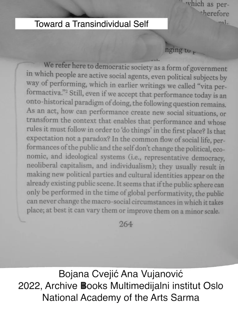 Cvejić, B., & Vujanović, A. (2022). Toward a trans individual self: A study in social dramaturgy. Oslo National Academy of the Arts.